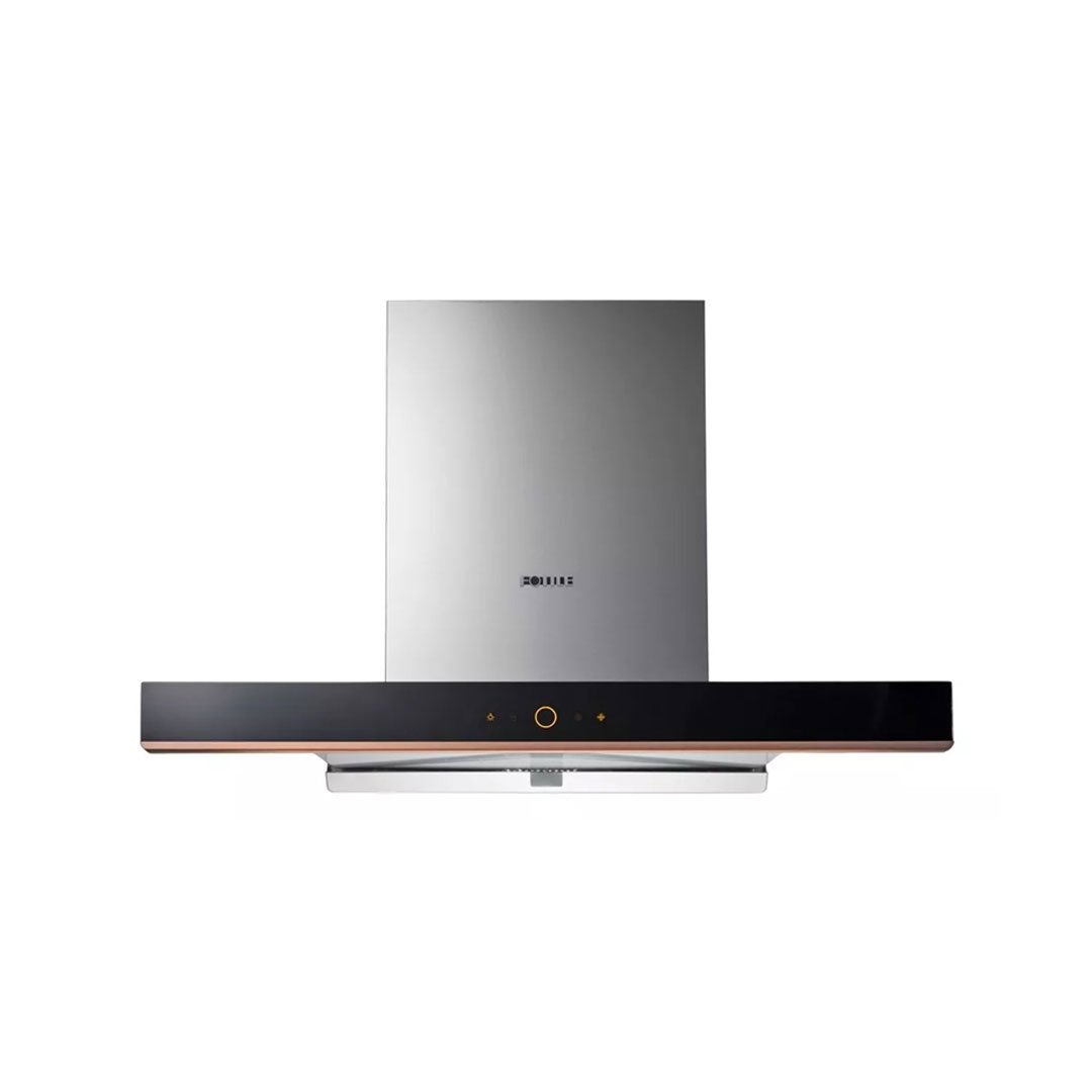 Fotile EMG9035 Chimney Kitchen Hood, a 90cm wide stainless steel hood featuring an elegant black panel design. Equipped with advanced Wing-Like Surround Suction Technology and a Brushless DC Inverter Motor, this hood ensures efficient smoke and odor extraction, making it an ideal choice for modern kitchens in Lahore