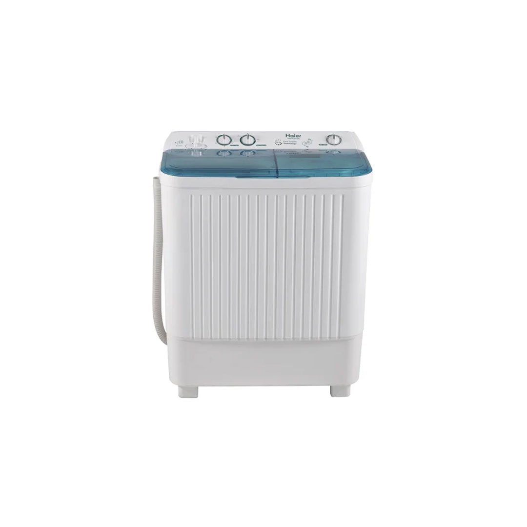 Haier Twin 80-AS Washing Machine 8kg. This semi-automatic twin tub washer offers an 8kg wash capacity, ideal for medium-sized households. Its durable virgin plastic body ensures longevity, while the powerful pulsator delivers deep cleaning. Enjoy efficient washing with low noise operation.